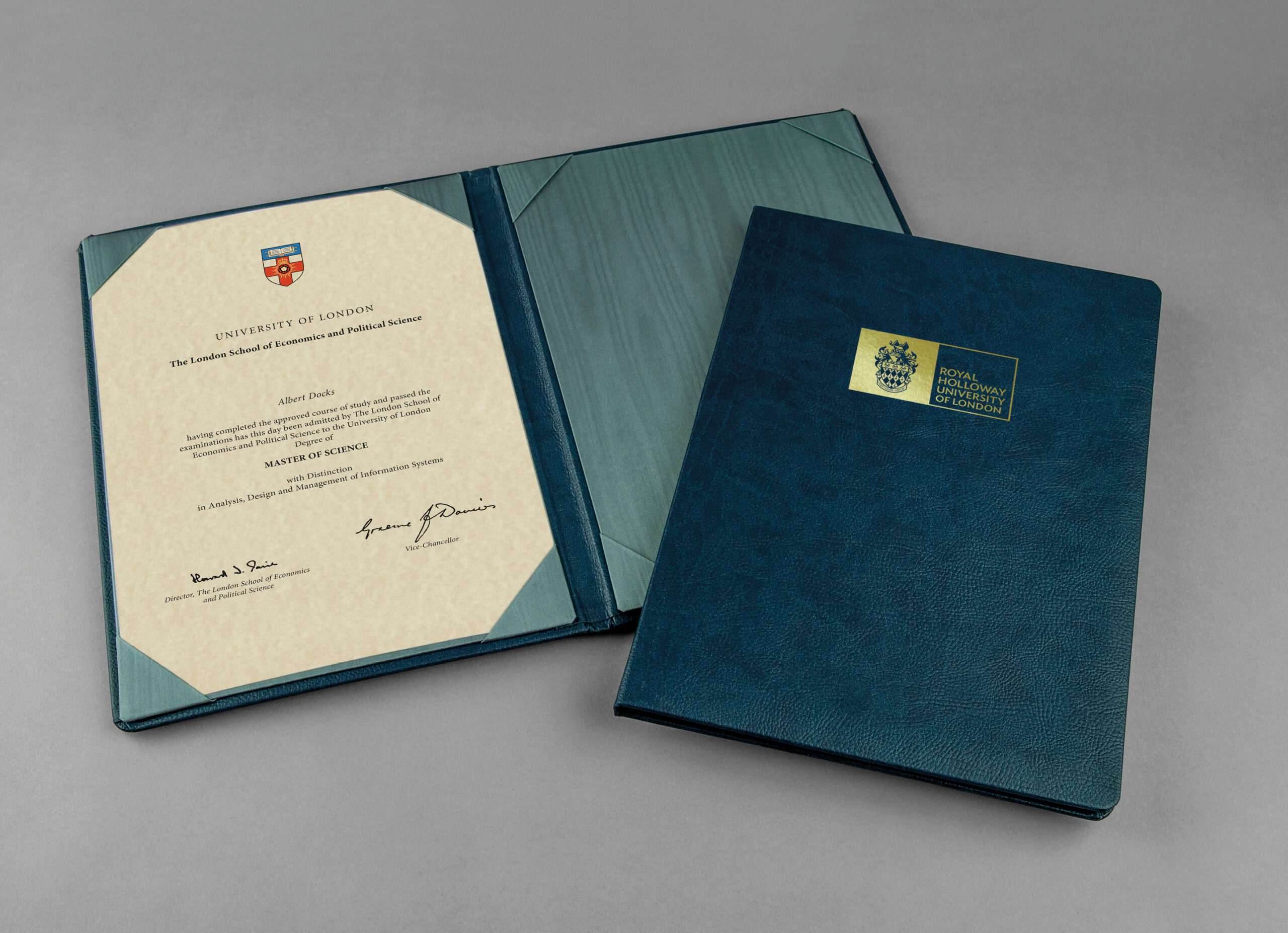 Degree certificates have a tendency to become lost or damaged. Preserve yours in pristine condition in a luxury certificate holder. With a cover in navy leather effect material with Royal Holloway wording and crest printed in gold, the grey watered-silk interior is designed to hold either 1 or 2 parchment certificates. Overall dimensions 318 mm tall x 225 mm wide with 14mm spine.